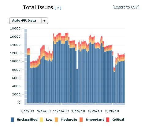 The Total Issues graph adds the number of relevant issues for each computer and then groups them by their severity rating. An issue is a Fixlet message that is relevant on any computer in your network. For example, if you have a computer with five relevant Fixlet messages and a second computer with three relevant Fixlet messages, the total number of issues is eight, even if some of those messages are the same.