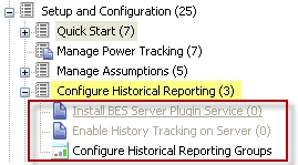 The Configure Historical Reporting subnode under Setup and Configuration includes tasks for installing the BES Server Plugin and enabling historical tracking on a server, and a wizard for configuring historical reporting groups.