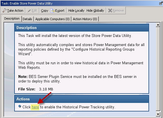 To enable History Tracking on a server, click the appropriate task from the navigation tree. Click in the Actions box of the task window to enable the Store Power Data Utility.