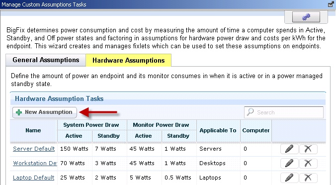 If you do not have Hardware Assumptions set, you are using default values. To override default values with values specific to your deployment, click New Assumption.