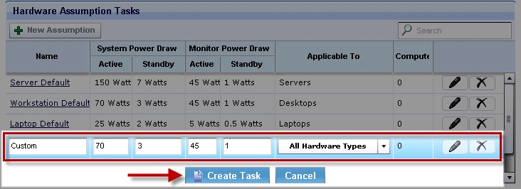 After clicking New Assumption, an additional row displays at the bottom of the window, where you can manually populate fields corresponding to the new task Name, System Power Draw, Monitor Power Draw, and the applicability to different hardware types. When complete, click Create Task, click OK, and enter your Private Key Password. Click in the Actions box of the task window to deploy the action.
