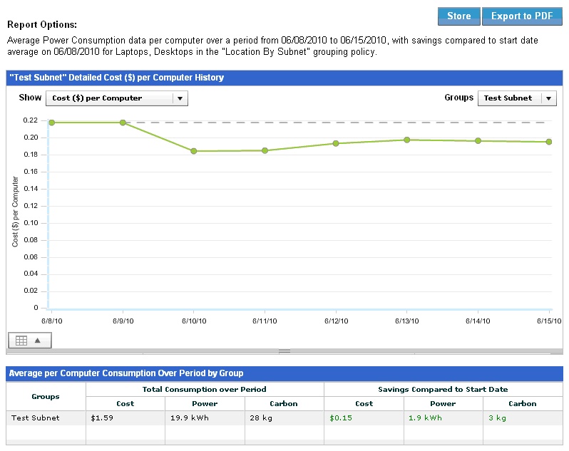 The Power consumption over time report charts the average computer power consumption over a specified time period, and displays cost or savings compared to a baseline cost based on the start date. Use this report to review historical savings and progress of power management policies. You must have Historical Power Tracking enabled to use this report.