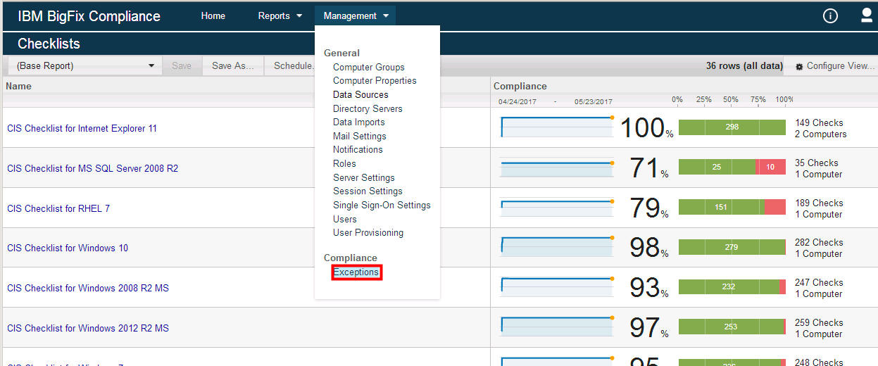 Managing exceptions Set exceptions to exclude data from your compliance reports. From the Management drop-down menu, click Exceptions.