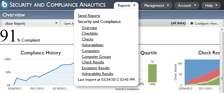 Global Navigation refers to the primary dropdown menus at the top of the BigFix Compliance Analytics primary dashboard. Click the Reports dropdown menu to navigate through the different report types. Users with appropriate permissions also see a Management drop-down menu to view and manage the deployment configuration.