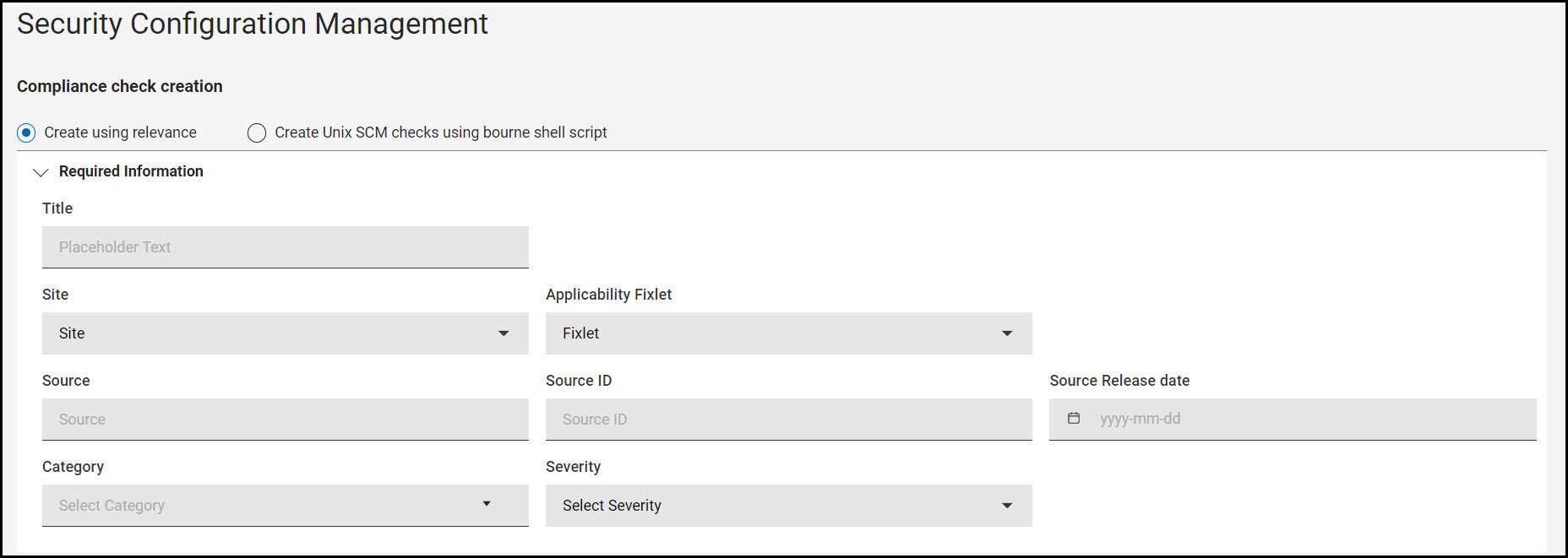 Compliance check creation wizard appears.Note: Create using relevance is the default method in the Compliance check creation wizard.
