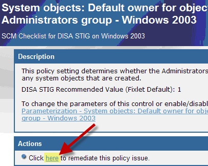 Many Fixlet controls have built-in Actions to remediate an issue. To start the remediation process, click the link in the Actions box.