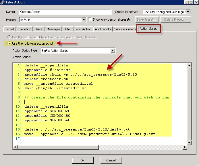 // create a script that will create the necessary directory delete __appendfile appendfile #!/bin/sh appendfile mkdir –p ../../scm_preserve/SunOS/5.10 delete createdir.sh move __appendfile createdir.sh wait /bin/sh ./createdir.sh // create the file containing the checks that you wish to run delete __appendfile appendfile GEN000020 appendfile GEN000480 appendfile GEN000560 delete ../../scm_preserve/SunOS/5.10/daily.txt move __appendfile ../../scm_preserve/SunOS/5.10/daily.txt - Run the runme.sh script with the –F option. Modify the