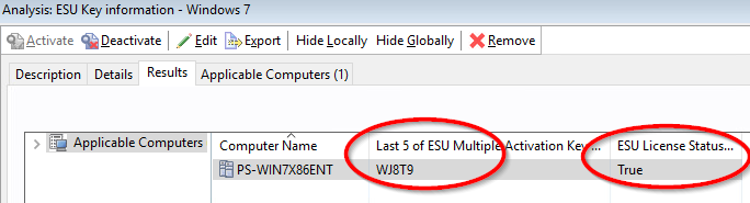 各 BigFix ESU パッチ適用アドオン・サイトには、ESU キーがインストールおよびアクティブ化されているサブスクライブ済みエンドポイントと、「インストールされた MAK の末尾 5 文字」プロパティーを提供する 「ESU マルチ・ライセンス認証キーの末尾 5 文字」プロパティーを特定する、「ESU ライセンス・ステータス」プロパティを使用する分析が含まれます。