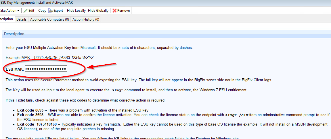 各 ESU パッチ適用サイトで Fixlet が提供され、一度に多くのエンドポイントで Microsoft® から受信した ESU マルチ・ライセンス認証キー (MAK) のアクティブ化と非アクティブ化を自動化します。 「ESU キー管理: MAK のインストールとアクティブ化」タスクでは、Fixlet の説明で ESU キーを安全に入力し、ターゲットのエンドポイントでキーをインストールおよびアクティブ化するためのアクションを実行できます。同様に、「ESU キー管理: MAK の非アクティブ化とアンインストール」タスクでは 、エンドポイントにすでにインストールされている任意の ESU キーを削除できます。