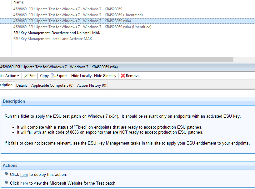 各「BigFix ESU パッチ・アドオン」サイトには、エンドポイントで ESU パッチ適用機能をテストする Fixlet が含まれます。いずれかに対してアクションを実行し、結果が「修正済み」であることを検証します。エンドポイントが ESU テスト・パッチを正常に受け入れることができる場合は、そのエンドポイントで ESU パッチ適用の準備が整っていることを意味します。