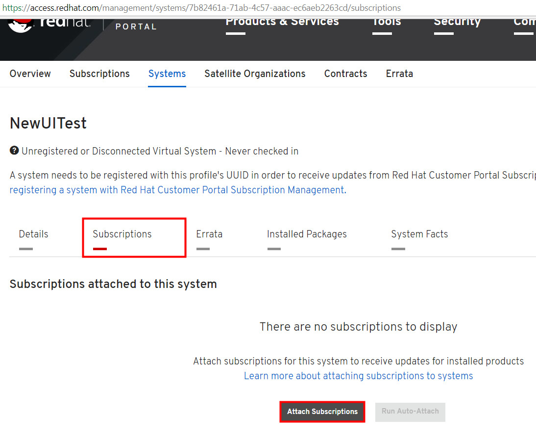ページが更新されたら、「サブスクリプション (Subscriptions)」タブをクリックし、「サブスクリプションの付加 (Attach Subscriptions)」をクリックします。