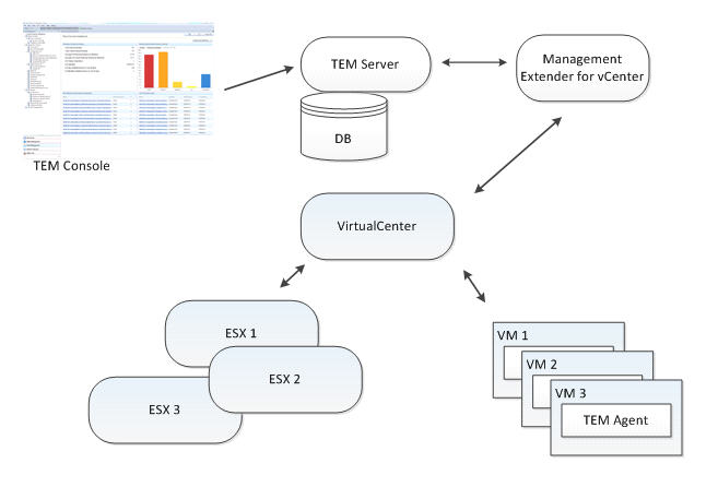 以下の図は、Virtual Endpoint Manager がご使用の環境で動作するためにどのように設計されているかを視覚的に示したものです。