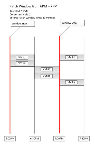以下の図は、同時値が 2、パッチ・ウィンドウ時間が 30 分に設定されている 5 台の対象仮想マシンの例を示しています。