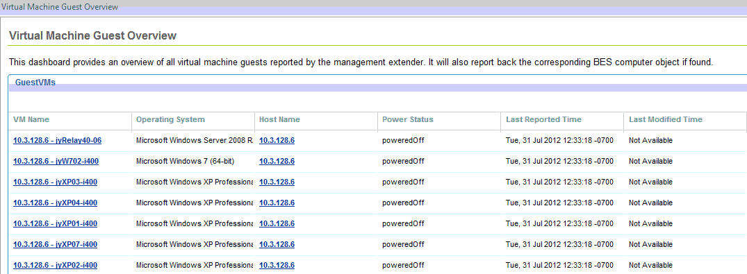 「Virtual Machine Guest の概要」ダッシュボードには、Management Extender が VMware API を介して報告した仮想マシン・オブジェクトの一覧が表示されます。ダッシュボードでは、仮想マシン・オブジェクトと BigFix オブジェクトが関連付けられます。リストから、BigFix エージェントがデプロイされているマシンを表示できます。