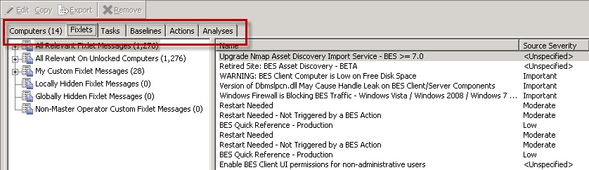 「セキュリティー・パッチの概要」タブと「非セキュリティー・パッチの概要」タブにある、少なくとも 1 つのパッチを必要とするコンピューターのリンクは異なるものです。「セキュリティー・パッチの概要」タブには「きわめて重要なパッチが 1 つ以上必要なコンピューター」リンク、「非セキュリティー・パッチの概要」タブには「非セキュリティー・パッチが 1 つ以上必要なコンピューター」リンクがあります。両方のリンクにより、「Fixlet の一覧」ウィンドウが開いて、関連する Fixlet、コンピューター、タスク、ベースライン、アクション、および分析を確認することができます。