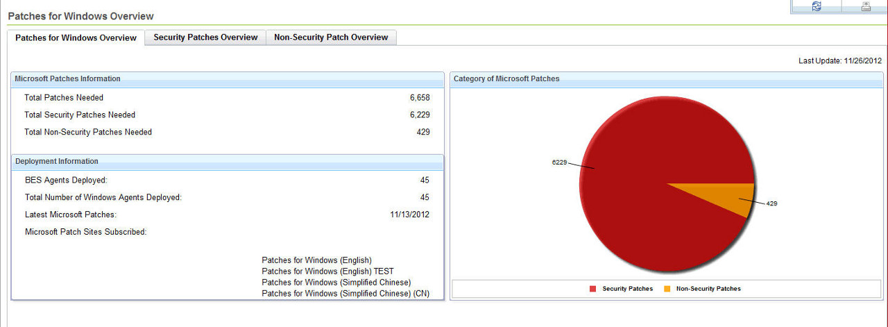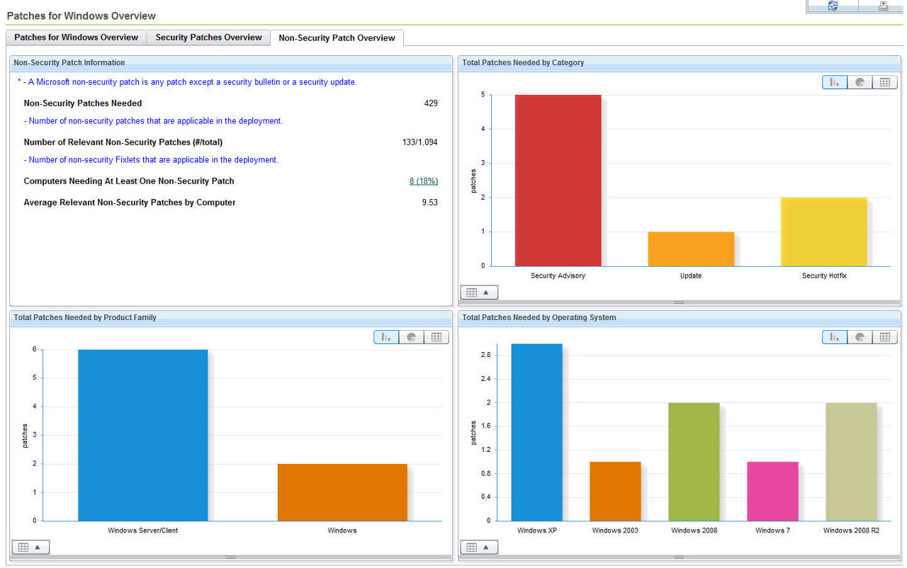 Windows 向けパッチの概要ダッシュボードは、適用環境で必要なセキュリティー・パッチおよび非セキュリティー・パッチの明細を表示する場合に使用します。
