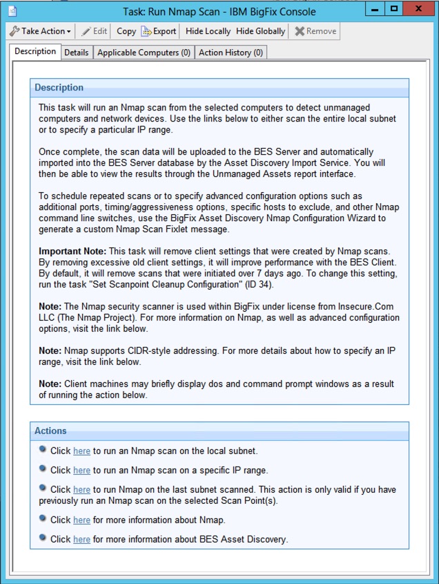 ワークエリアでこのタスクが開いたら、「アクション」ボックスで、Nmap スキャンを開始するための有効なリンクの 1 つを選択します。ローカル・サブネットまたは大規模サブネットを指定できます。