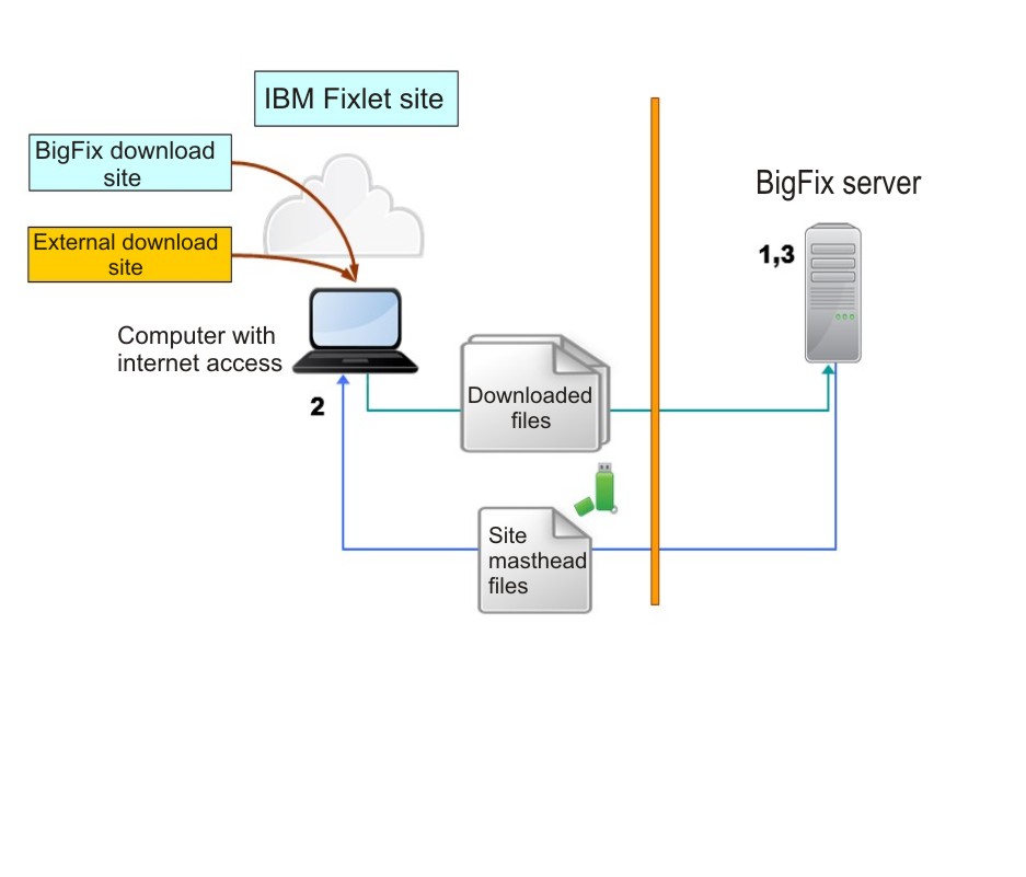 - インターネット側のコンピューターで、各サイト・マストヘッド・ファイルに対して BES Download Cacher ユーティリティーを実行し、サイト・マストヘッド・ファイルが表すサイトから参照されるファイルをダウンロードします。