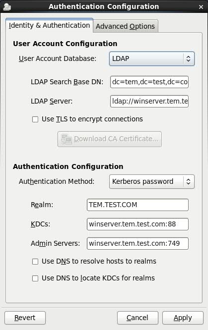 ldap://winserver.tem.test.comのように指定します。 - 「認証方式」で、「Kerberos パスワード」を選択します。