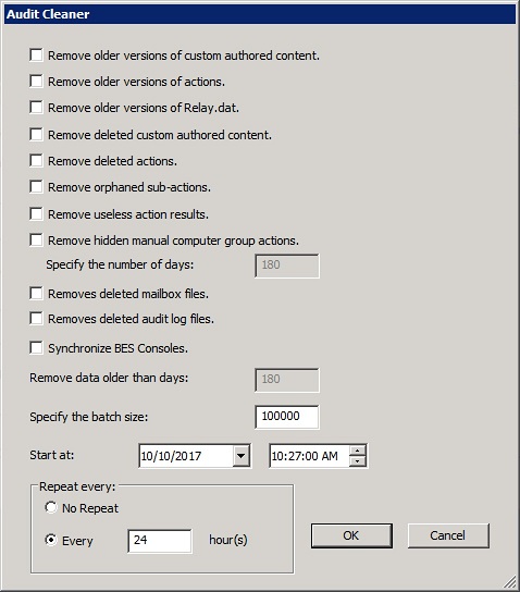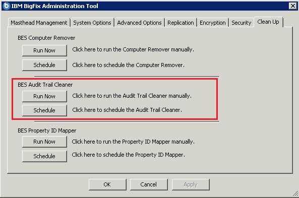 上記のすべてのデータをデータベースから自動的に削除するには、BigFix 管理ツールのBES Audit trail Cleanerで「スケジュール」をクリックします。これにより、削除処理がスケジュールされます。