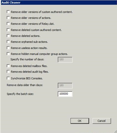 - BES コンソールを同期する - BigFix コンソールには、データベースのローカル・キャッシュが保存されます。監査証跡クリーナー・ツールを使用してデータを削除すると、このローカル・キャッシュが非同期の状態になります。この状態を回避するため、監査証跡クリーナー・ツールは、データベース内にフラグを設定します。これにより、BigFix コンソールを次回に起動すると、すべての BigFix コンソールで強制的にキャッシュが再読み込みされます。