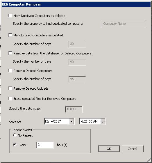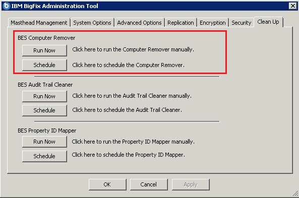 BigFix コンソールからコンピューターを自動的に削除し、データベースからそのデータを自動的に削除するには、BigFix 管理ツールのBES Computer Removerセクションで「スケジュール」をクリックします。これにより、削除処理がスケジュールされます。