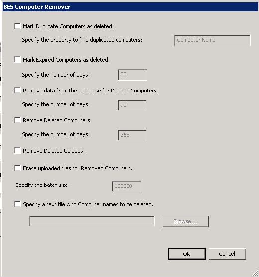 - 特定のコンピューターを削除するには、「削除するコンピューター名が含まれているテキスト・ファイルを指定する」を選択し、改行で区切られたコンピューター名のリストが含まれているテキスト・ファイルの名前を入力します。コンピューターの削除操作がスケジュールされている場合、このオプションは使用できません。注: テキスト・ファイルを使用してコンピューター名を削除すると、テキスト・ファイルで "%" 文字がワイルドカードとして使用できるようになり、ツールによって "%" 文字の前に指定したテキスト文字列で始まるすべてのコンピューター名を削除できます。