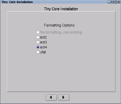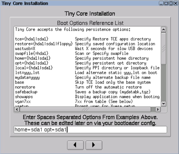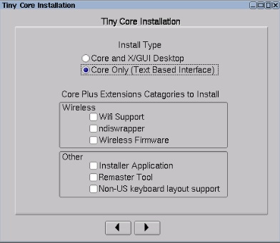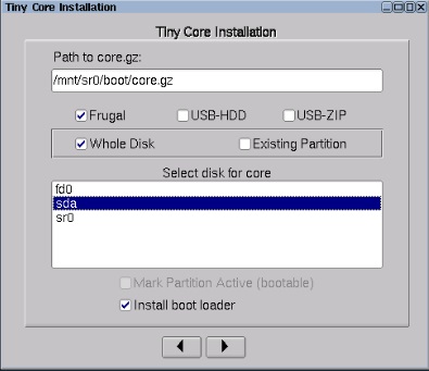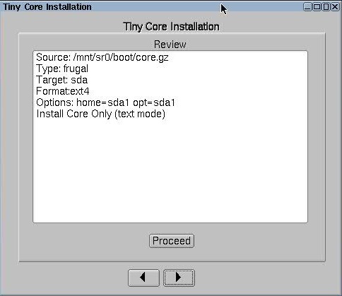 Tiny Core のインストールを開始し、以下のパネルに従って、空のハード・ディスクにインストールします。