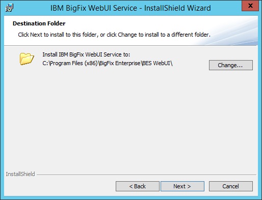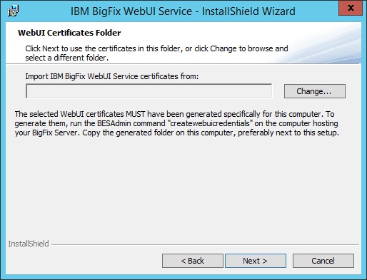 注: WebUI をインストールするコンピューターには、証明書が生成されている必要があります。この証明書を生成するには、BESAdmin.exe /createwebuicredentialsコマンドを実行します。コマンドについて詳しくは、追加の管理コマンドを参照してください。 - WebUI インストール・フォルダーがデフォルトのフォルダーとは異なる場合、参照して選択します。