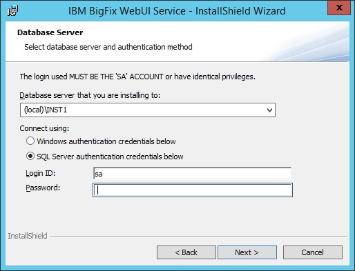 - BigFix データベース・サーバーと、関連する認証方法を指定します。Windows 認証または SQL Server 認証のいずれかを使用してデータベースに接続できます。WebUI が正常に動作するには、sysadmin 権限を持つユーザーを指定する必要があります。