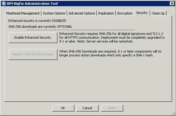 「拡張セキュリティーを有効にする」ボタンをクリックすると、すべてのデジタル署名とコンテンツ検証に SHA-256 暗号ダイジェスト・アルゴリズムが採用され、BigFix コンポーネント間通信に TLS 1.2 プロトコルが使用されます。