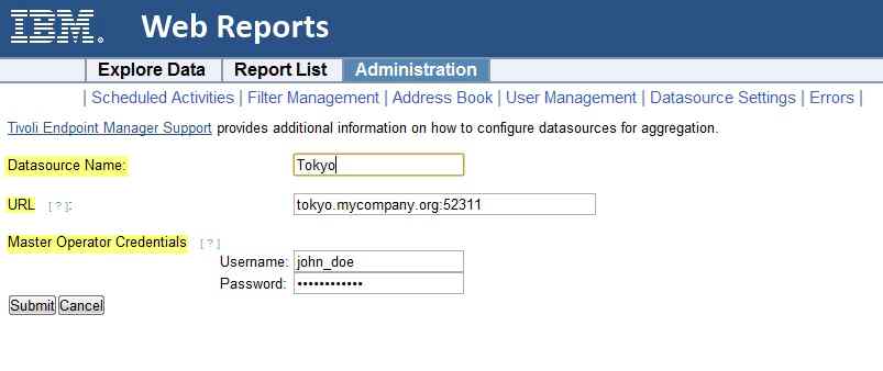 他の BigFix データ・ソースをレポートに追加できます。これにより、それぞれに数千台のコンピューターがある数百のオフィスを対象とする集計レポートを作成できます。Web レポート・サーバーで異なる FXF エンコード方式が使用されているデータ・ソースは集約できないことに注意してください。