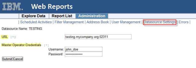 接続先にするルート・サーバーの URL を入力します。URL には、適切なポート番号も含める必要があります。注: データ・ソースの名前は変更できません。 - URL を変更する場合は、マスター・オペレーターの認証情報を入力します。