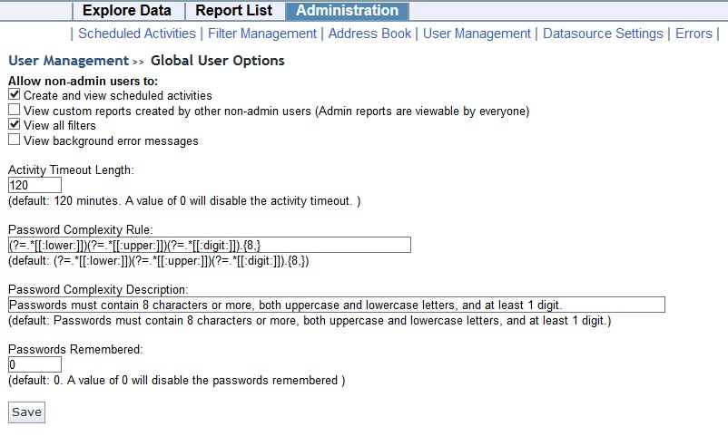 このページは、「管理者」>「ユーザーの管理」>「グローバル・ユーザー・オプション」から使用できます。すべてのユーザーによって共有されるいくつかの管理パラメーターを設定できます。