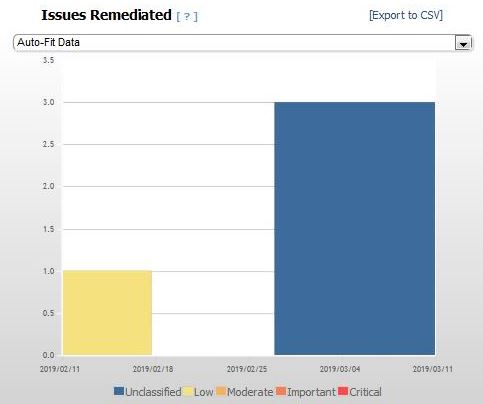 これは履歴グラフです。グラフの上にあるポップアップ・メニューから時間目盛りを選択します。このグラフは、修正済みの問題の重要度を表すために色分けされた棒を表示します。カーソルを使用して、データを強調表示できます。