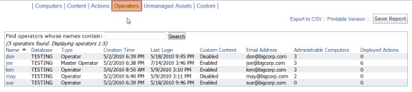 「オペレーター」リストは非常に単純で直観的です。BigFix 環境のすべてのオペレーターのリストがあり、それぞれのタイプおよび管理権限が表示されます。このリストを編集することはできませんが、オペレーターの名前でフィルタリングすることはできます。