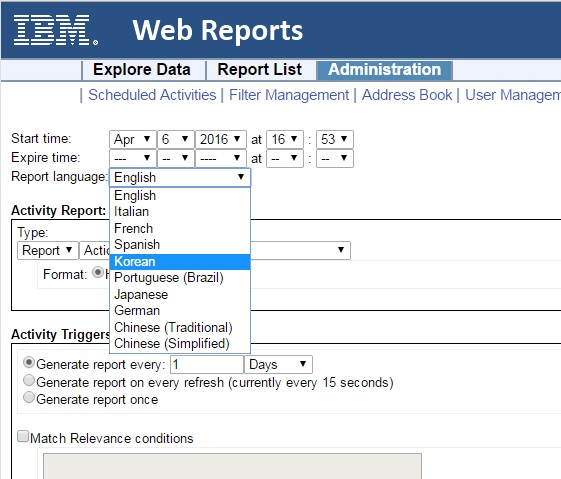 - 「アクティビティー・レポート」セクションでは、スケジュールするレポートおよびそのフォーマットを選択します。プルダウン・メニューから、必要なレポートを選択します。