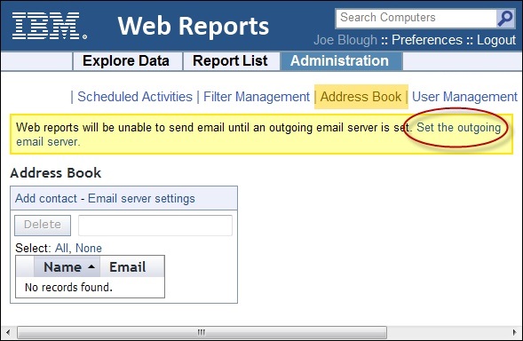 一般的なニーズの 1 つは、レポートをオペレーターまたは管理者にメールで送信することです。こうすると、オペレーターまたは管理者は、時間に余裕のあるときに BigFix ネットワークのさまざまな側面を簡単に調べることができます。以下のように電子メール・アカウントおよびサーバーをセットアップします。