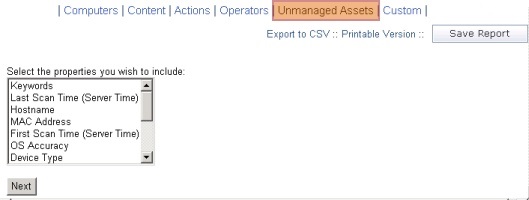 ネットワーク内の非管理資産が表示されたら、表示したいプロパティーをクリックできます。Shift キーまたは Ctrl キーを押しながらクリックすることもできます。レポートを表示するには、「次へ」をクリックします。