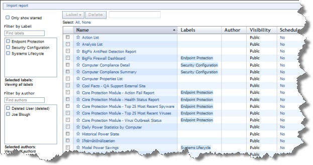 - ウィンドウの左側にあるボックスを使用すると、レポートをラベルおよび作成者でフィルタリングできます。これにより、不要なレポートを非表示にして、簡潔なレポート一覧を表示できます。指定するには、フィルターの前にあるチェック・ボックスをクリックします。複数のフィルターは論理和演算されます。