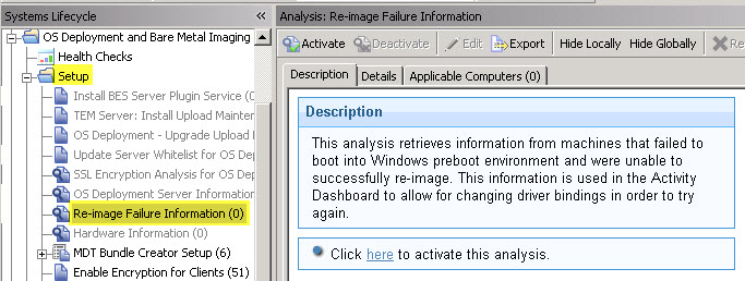 The Re-image Failure Information is used to retrieve information from machines that failed to boot into the Windows preboot environment and were unable to successfully re-image. This information is used in the Activity Dashboard to change the driver bindings and try the boot again.