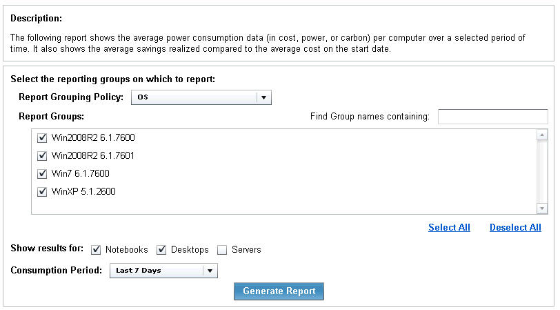 The Power consumption over time report charts the average computer power consumption over a specified time period, and displays cost or savings compared to a baseline cost based on the start date. Use this report to review historical savings and progress of power management policies. You must have Historical Power Tracking enabled to use this report.