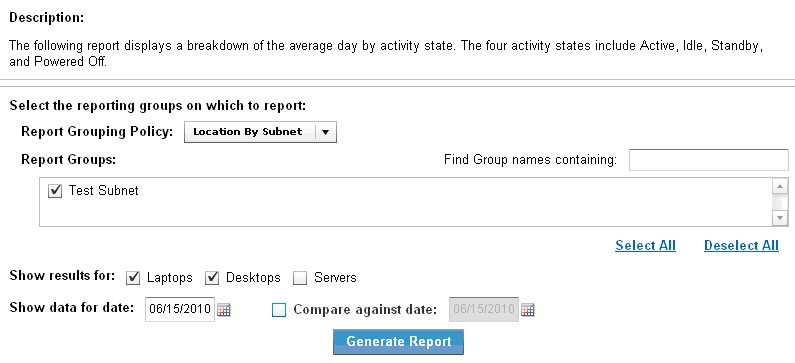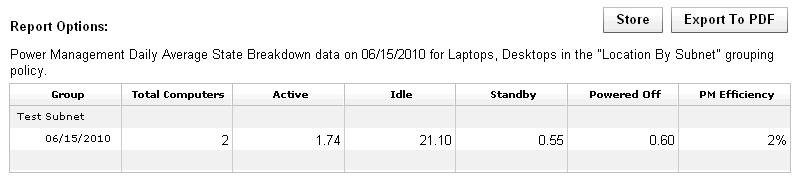 The Power Management Daily Activity State breakdown report displays a breakdown of the average day by activity state. The activity states are Active, Idle, Standby, and Powered off. You can use this report to evaluate changes you make to your power policies. For example, if many computers have high idle times, you set a Standby power policy to save significant power. It can also be set to compare improvements between two different days. The comparison function requires that historical power tracking is enabled.