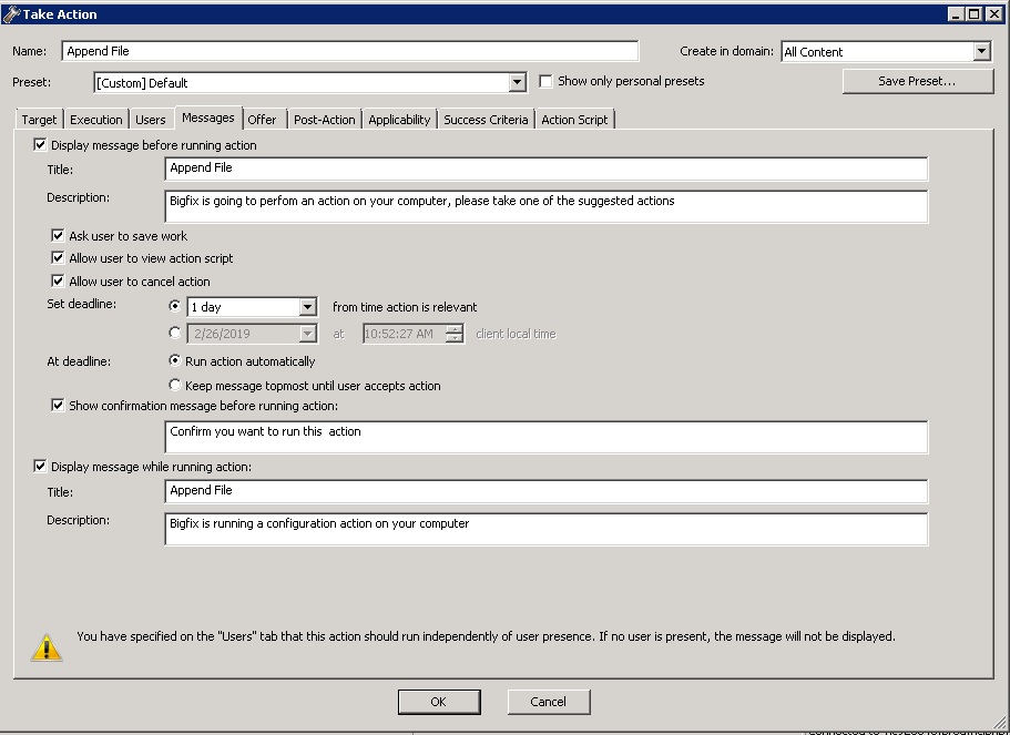 If the BigFix Console operator specifies the following settings in the Messages tab of the Take Action panel: