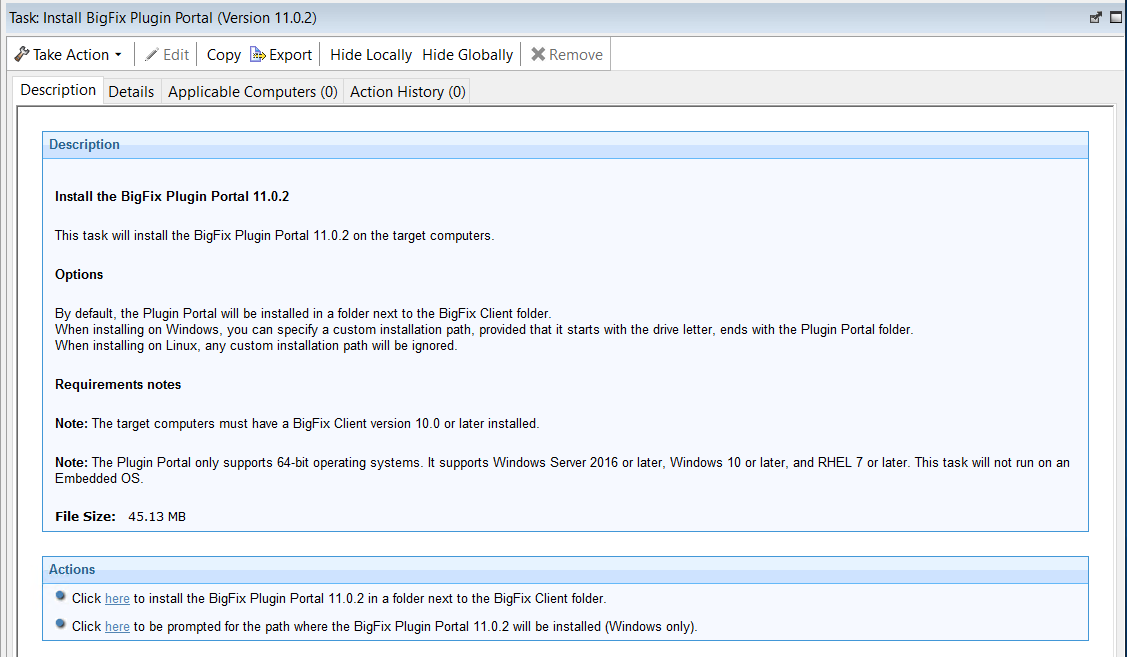 To install the Plugin Portal on a BigFix Agent, run the Task named Install BigFix Plugin Portal (Version x) from the BES Support site. This Task installs the BigFix Plugin Portal version x.x on the selected targets.