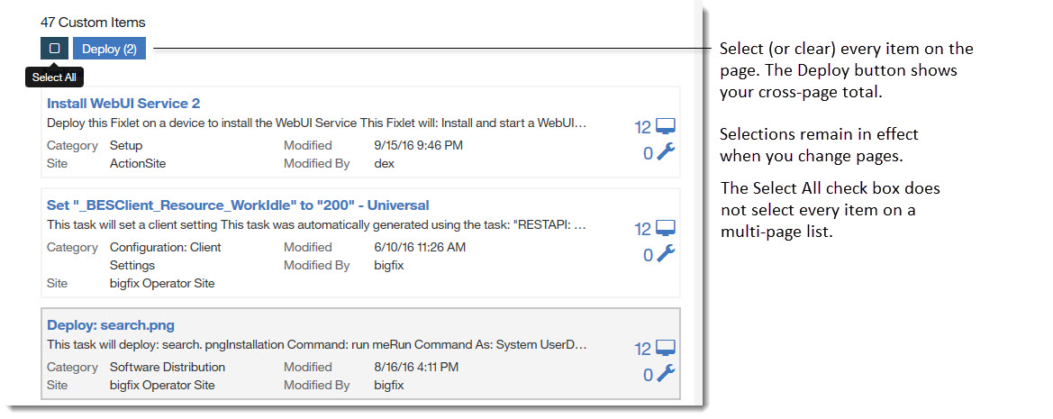 The Select All check box selects or clears every item on a page.