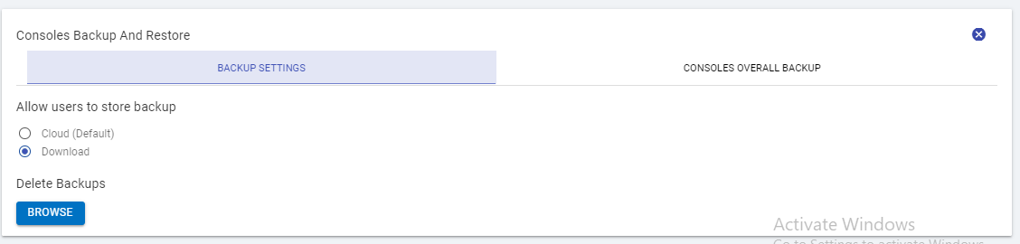 Backup and Restore settings can be configured by accessing the master configuration console. The administrator/user may route to the console and can change the download settings, delete backups or create an entire console backup and may restore the same from there by following the steps mentioned previously for creating/restoring a backup.