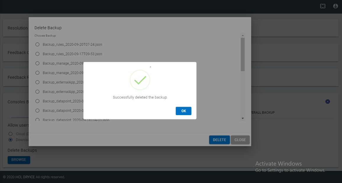 Along with this, the settings consist of functionality to delete the backups created. The administrator may delete backups from the list fetched upon by clicking on browse button. Only a single backup can be selected and deleted at a time from the list. Upon successful deletion of backup, user may find a message as shown in figure below: