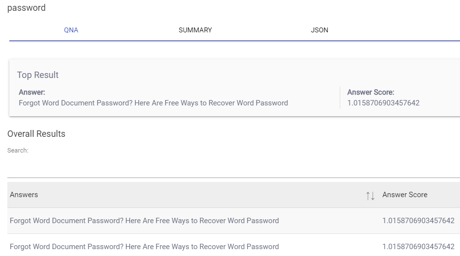 - Click Submit and get the result of the query in the QNA, summary and JSON.