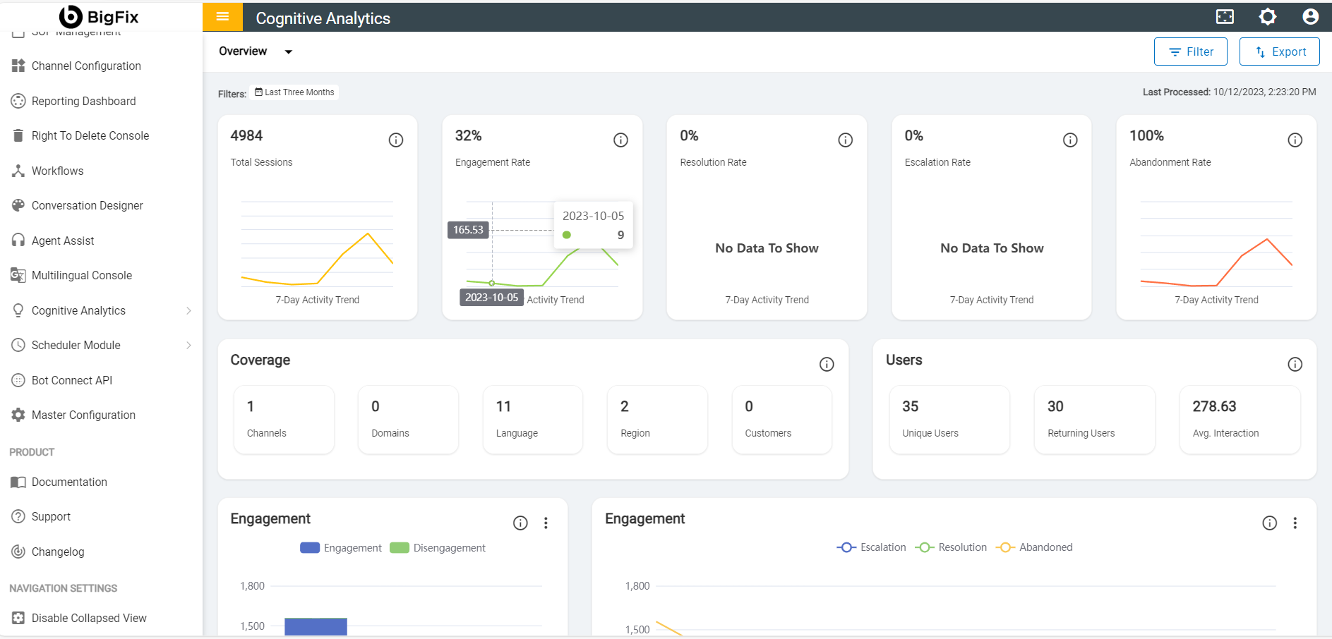 This console allows admin users to analyze and gain insights of the use case performance, focusing on aspects where the use cases satisfied or failed to provide a response to the user query and further emphasize on the factors in case of failure. The factors may include scenarios where BigFix AEX did not understand the query at all or understood the user query but failed to provide the SOP that would resolve it. Moreover, the objective of the console is to provide holistic reporting documentation provided by BigFix AEX out of the box.